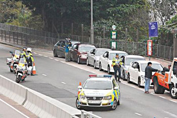 10日清晨6時(shí)30分,警方接獲多個(gè)市民舉報(bào),指有10多輛汽車,高速沿薄扶林道向香港仔飛馳,懷疑有人進(jìn)行非法賽車。警方于是在薄扶林村對(duì)面設(shè)立路障阻截,并派出一輛警車從后包抄。參與非法賽車的車輛,駛近薄扶林村發(fā)現(xiàn)前有警員守候時(shí),紛紛掉頭,向中環(huán)方向高速竄逃。
