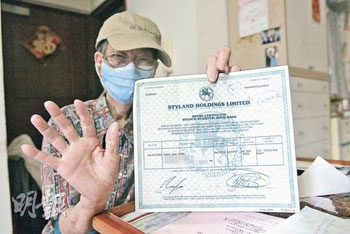 涉事小股東包括不少長者,74歲的陳婆婆于2001年及之前曾分批購入15萬股大凌集團股票,作為兩夫婦的棺材本;歼^大病的她,說已記不清楚買入股票的日子。由于1997至2001年間大凌股價由高位13元大幅滑落谷底,記者推算估計其投資總額由6500元至數(shù)萬元不等。