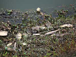 位于南粵批發(fā)市場后至青洲美樂花園之間的一段鴨涌河,可見有不少死魚尸體在水面漂浮,有些因河道水位下降,擱淺在近岸的泥沼草叢上,尸身已發(fā)脹且開始腐爛及發(fā)出腥臭味,附近居民反映在晚間睡覺時不時聞到陣陣腥臭味。