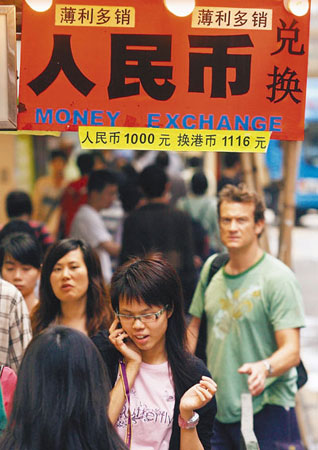 有專賣內(nèi)地書籍的樓上書店負責人說,近半年來書價改了又改,原來以1兌1,將書底人民幣訂價兌換成港幣售價,早前已變成1兌1.3,近日更升至1兌1.6。有見人民幣愈來愈“好使”,不少市民紛紛買入人民幣“儲起來等升值”,兌換店生意宗數(shù)較前增加10%,利潤卻銳減50%。