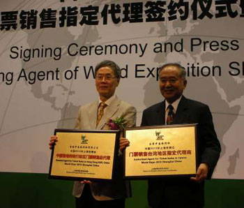 中新網(wǎng)3月3日電 據(jù)香港《大公報(bào)》報(bào)道,“中國(guó)2010年上海世博會(huì)門票銷售制定代理簽約儀式暨媒體見面會(huì)”2日下午在上海世博局舉行,此次簽約的13家銷售代理商,境內(nèi)代理商4家,境外代理商9家。香港中國(guó)旅行社成為首批簽約的上海世博會(huì)門票境外指定代理商之一,香港中旅總經(jīng)理周來(lái)衛(wèi)接受了上海世博局授牌。