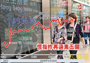 中新網(wǎng)4月30日電 據(jù)香港《文匯報(bào)》報(bào)道,市場(chǎng)憧憬國(guó)務(wù)院宣布將上海建設(shè)成國(guó)際金融中心及航運(yùn)中心的細(xì)節(jié),A股29日午市急升近3%,刺激香港中資股升幅擴(kuò)大,令港股在豬流感陰霾下連跌2天后終見反彈,于29日期指結(jié)算日被挾高,以接近全日高位收市,收?qǐng)?bào)14956.9點(diǎn)升401.8點(diǎn),總成交508億元。