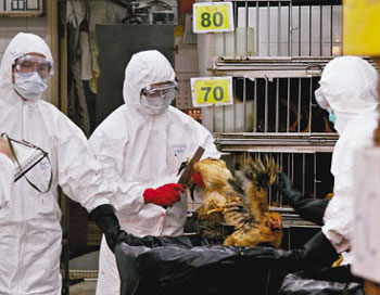 六月十一日,香港食環(huán)署人員穿著保護(hù)袍服到街市圍封活家禽零售點(diǎn)。漁護(hù)署當(dāng)天宣布由于在深水埗等四個(gè)街市的雞只樣本,化驗(yàn)出H5N1病毒呈陽(yáng)性反應(yīng),因此決定于全港街市屠殺活家禽。漁護(hù)署表示,病毒源頭不排除是走私雞。 中新社發(fā) 譚達(dá)明 攝