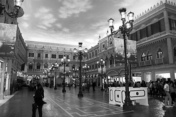 走在澳門(mén)威尼斯人度假村酒店,環(huán)顧四周,是威尼斯水城般的意大利建筑;抬頭,“藍(lán)天白云”的天幕足夠以假亂真;耳邊,回旋著薩克斯的樂(lè)音;這邊,剛和駕駛著貢多拉船在運(yùn)河中徜徉的 “圣誕老人”打過(guò)招呼,那邊,迎面走來(lái)了邊行進(jìn)邊表演的小丑……