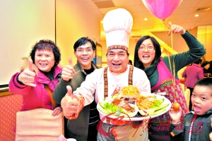 “各位貴賓,大家好,非常榮幸能在中華民族最重視的傳統(tǒng)佳節(jié)里,為大家準備臺灣地區(qū)傳統(tǒng)的‘圍爐’,現在我開始為大家上菜,這道菜里有鮑魚,還有醉蝦……”昨晚6時剛過,臺北“頂廚國宴”餐廳的廚藝總監(jiān)黃德忠身著喜慶的廚師服,親自為廣之旅的四桌游客端上了年夜菜肴。