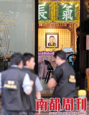 在靈堂掛著的另一副更正式的挽聯(lián)是:“劍膽無畏,永不妥協(xié)。”靈堂祭奠的死者,新義安近年最“出位”的黑道頭目,拼殺20余年的李泰龍,最終在8月4日凌晨,在自己的地盤尖沙咀,被仇家有計劃地斬殺。短短30秒的車撞、刀砍,曾經(jīng)傷人無數(shù)的他,最終血噴街頭而終,震撼香港。