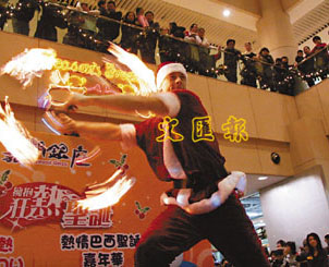 據(jù)香港文匯報(bào)報(bào)道,25日天水圍商場嘉湖銀座舉行了“圣誕火熱勁舞show”,邀請來自澳洲的火焰舞蹈團(tuán)到香港表演。3人組成的表演隊(duì)伍手持煙火,做出一系列高難度動(dòng)作,包括跳舞、噴火、玩呼拉圈和踩高蹺,吸引在場大批小朋友拍手大笑和爭相與他們合照。