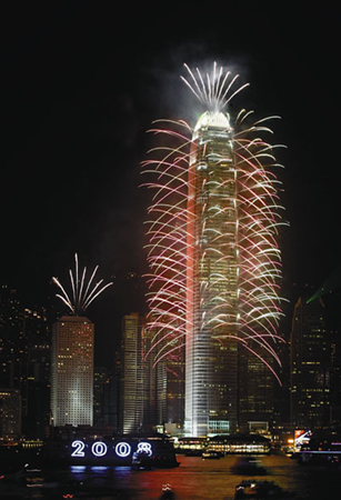 二十三時(shí)五十九分,行政長(zhǎng)官曾蔭權(quán)在尖沙嘴文化中心啟動(dòng)倒計(jì)時(shí)儀式。二00七年的最后二十秒,國(guó)金二期北面外墻兩側(cè)由三十二層起依次向上燃放焰火,火樹(shù)銀花照耀整個(gè)維港;合和中心、AIG大廈、長(zhǎng)江集團(tuán)中心及東企業(yè)廣場(chǎng)四棟大廈,外墻同時(shí)顯示倒計(jì)時(shí)時(shí)間,停泊在維港的滅火輪則向海面噴射多樣的水花……