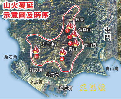 有關(guān)部門(mén)發(fā)言人形容,這次山火所到之處都變成焦土,幸虧消防處救火策略成功,設(shè)定7個(gè)重點(diǎn)保護(hù)區(qū)救火,包括青山禪寺、山頂?shù)陌l(fā)射站、高壓電纜站和散石灣新村山坡等區(qū)域。