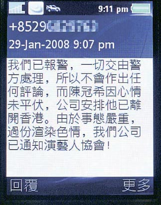 據(jù)了解,部分裸照可能源于一部已遺失或曾交予他人修理的手提電腦,不過,事件關(guān)鍵人物陳冠希,其經(jīng)理人29日通過手機(jī)短訊回應(yīng)傳媒時(shí)指出,由于陳冠希心情未平復(fù),公司安排他離開香港。