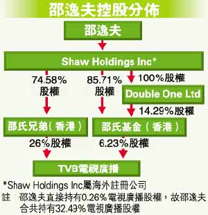 目前邵逸夫透過邵氏兄弟(上市公司)、邵氏基金及個人直接持有,合共持有電視廣播32.49%股權(quán)。若有買家對電視廣播有興趣,可向邵氏直接購入電視廣播股權(quán),或收購市值較低的邵氏兄弟,達(dá)至以較低成本間接控制電視廣播。