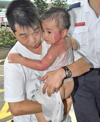 慘被熱湯灼傷的男童姓洪(譯音),1歲半大,與家人居于葵涌一單位,父母約30多歲。男童送院時在父親懷中不斷嚎哭,全身赤裸但敷上保護膜,其背部、左前臂及左臉頰全部紅腫,大幅表皮脫落,露出粉紅嫩肉,據(jù)悉約有三成半皮膚被灼傷,狀況令人慘不忍睹。