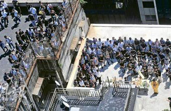14日上午10時,蕭永方的妻女及親友,連同陳兆龍的父母、好友及其它消防員戰(zhàn)友,約170人抵達災(zāi)場地下,親友及旺角消防局人員先登上嘉禾大廈天臺,由于人數(shù)太多,部分人需站到相鄰的永如大廈天臺。