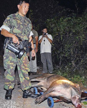 中新網(wǎng)9月19日電 據(jù)香港大公報報道,18日,一頭野豬闖入香港元朗牛潭尾民居,爆發(fā)“人豬大戰(zhàn)”。一頭重200斤的野豬進(jìn)村覓食時受驚,誤闖村屋空地,戶主及街坊等四人分持斧頭、犁耙合力捕捉,結(jié)果三人受傷,最后將野豬困鎖在廁所。警員接報趕至封鎖現(xiàn)場,狩獵隊入村將野豬射殺。