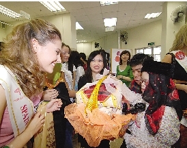 中新網(wǎng)10月30日電 據(jù)澳門日報報道,63位國際小姐候選佳麗29日到澳門扶康寶翠中心探訪智障人士。佳麗們除參觀中心設(shè)施外,并共同參與扶康學(xué)員日常的訓(xùn)練及工作,為弱勢社群獻上關(guān)懷。