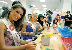 國際小姐候選佳麗到扶康中心參觀,順道制作手工藝品,向弱勢社群送上一份關(guān)懷。(圖片來源:澳門日報)