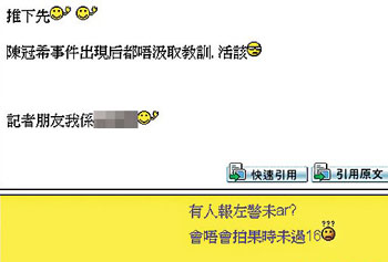 年初的陳冠希艷照門事件引起社會嘩然,各界關(guān)注網(wǎng)上色情資訊的監(jiān)察問題。香港互聯(lián)網(wǎng)協(xié)會主席莫乃光說,會方曾向?qū)W生派發(fā)互聯(lián)網(wǎng)使用守則,但一般網(wǎng)民的行為則難以控制:“其實陳冠希事件前后,網(wǎng)上一直都有性愛片段流傳,重點是有沒有人因此受害!彼f,所謂淫褻資訊的監(jiān)察,存在基本上的困難,因為某些網(wǎng)上論壇的成立,根本就是以成人話題為主,很難要求主持人刪去這些資訊。