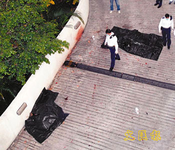 有街坊聽(tīng)到一聲巨響后,發(fā)現(xiàn)一男一女倒伏在芷葵樓一條緊急車輛通道,兩人相距約3米,大驚之下致電報(bào)警。救護(hù)員到場(chǎng),證實(shí)兩人頭爆肢折當(dāng)場(chǎng)死亡,警員事后以帆布架遮蓋尸體,然后上樓追查兩人墮樓位置。