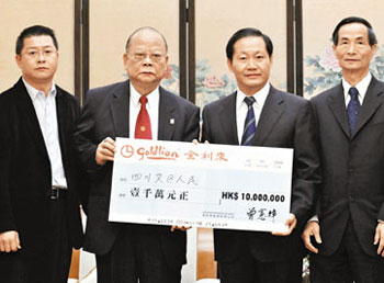 恒基兆業(yè)集團(tuán)主席李兆基亦于14日委托次子李家誠(chéng)送交由恒基兆業(yè)地產(chǎn)有限公司和中華煤氣公司捐贈(zèng)的1000萬(wàn)元賑災(zāi)支票。