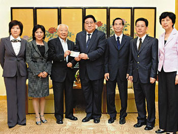 李東海基金有限公司15日慨捐1000萬,由李東海與兒子李君豪一起遞交了善款支票。 有近8年時(shí)間住在四川的香港知名工業(yè)家蔣震,在兩個(gè)女兒陪同下到中聯(lián)辦捐出1000萬元的支票。
