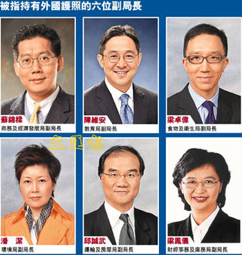 有傳媒28日引述“接近政府消息人士”稱,除候任商務(wù)及經(jīng)濟(jì)發(fā)展局副局長蘇錦梁被指持有加拿大護(hù)照外,另有5名候任副局長也被懷疑持有外國的居留權(quán),包括候任教育局副局長陳維安、食物及衛(wèi)生局副局長梁卓偉、環(huán)境局副局長潘潔、運(yùn)輸及房屋局副局長邱誠武、財(cái)經(jīng)事務(wù)及庫務(wù)局副局長梁鳳儀等,使事件更令人關(guān)注。