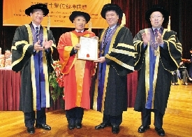 何厚鏵向李肇星頒授榮譽(yù)人文博士學(xué)位。(圖片來(lái)源:澳門日?qǐng)?bào))