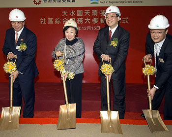 鄭汝樺15日在天水圍天晴村主持天晴社區(qū)綜合服務(wù)大樓動(dòng)土儀式時(shí)表示,房屋委員會(huì)將加快建筑和維修保養(yǎng)工程以創(chuàng)造就業(yè)機(jī)會(huì),并繼續(xù)致力協(xié)助低收入家庭解決住屋需要。