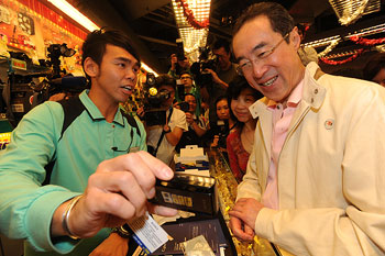 唐英年與多名官員及立法會議員到銅鑼灣的商店及餐館消費,鼓勵市民積極參與“促消費、保就業(yè)”行動。(圖片來源:香港特區(qū)政府網(wǎng)站)