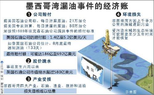 瑞士信貸銀行說(shuō),英石油清理漏油和應(yīng)對(duì)法律訴訟花費(fèi)將累計(jì)370億美元;高盛公司估計(jì)為330億美元;雷蒙德—詹姆斯合伙公司分析師說(shuō),美國(guó)涉及環(huán)境案件的司法制度“更有利原告方”,英石油“賬單”稅后將接近630億美元。