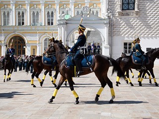 自2005年起,在氣候轉(zhuǎn)暖的4-10月,每逢周六中午克里姆林宮前就會進(jìn)行總統(tǒng)衛(wèi)隊步兵和騎兵的換崗儀式。其中,每月的前三個周六在克里姆林宮廣場進(jìn)行,剩下的在紅場進(jìn)行。(梁旭)