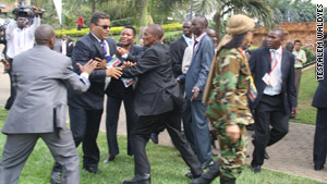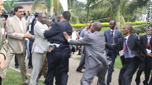 峰會第一天,利比亞總統(tǒng)衛(wèi)隊(duì)即與烏干達(dá)安全人員發(fā)生了拳腳沖突。根據(jù)CNN記者薩曼森納塔爾的描述,當(dāng)時(shí)正要舉行峰會開幕式。按照規(guī)定,只有國家首腦被允許進(jìn)入會場。利比亞總統(tǒng)衛(wèi)隊(duì)試圖護(hù)送卡扎菲通過入口,遂與烏干達(dá)安全人員發(fā)生爭論,隨后升級為肢體沖突,但是雙方?jīng)]有動槍。