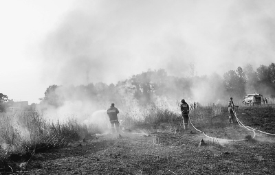 波塔波夫的話很快得到了驗證。就在記者返回途中,距莫斯科大約15公里處,路邊一個加油站附近起火。這個加油站南側(cè)有一道大約10米寬的隔離帶,再往外則是一個比足球場還大的草場,草場的東、西、南三面是森林。記者看到,100多米長的火龍借著風力向加油站方向翻滾而來。過火之處,留下黑乎乎的灰燼。加油站的職工用提水桶和臉盆盛著水往草場飛奔。