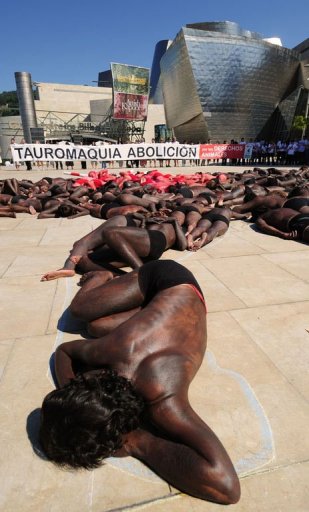 周末的抗議活動由國際動物保護團體策劃,抗議者在身上涂上紅色顏料,象征鮮血,倒臥地上排成牛只的圖形,并大聲疾呼,效法加泰羅尼亞地區(qū)禁止斗牛。