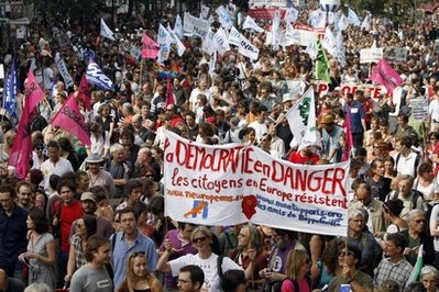 群眾揮舞旗幟、高舉橫額和抗議標(biāo)語,有人打鑼打鼓,高叫口號,要求薩爾科齊收回成命,停止壓迫吉卜賽人,也要停止執(zhí)行不人道的政策。