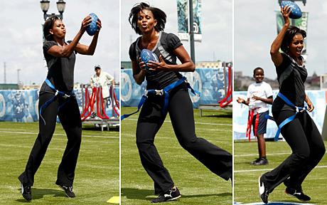 現在,這位備受關注的第一夫人又以身作則,她加入到由印第安納波利斯小馬隊教練托尼·唐奇、前坦帕灣海盜隊線衛(wèi)德里克·布魯克斯等橄欖球明星發(fā)起的旨在倡導青少年健康生活的美式橄欖球運動,在學生們面前大展她運動的天賦。