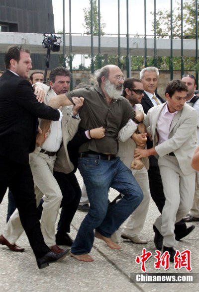 這起事件發(fā)生在希臘北部城市提薩羅尼其。希臘總理帕潘德里歐昨天到此出席一項(xiàng)國際展覽的開幕式,這名男子趁機(jī)向他丟鞋。不過,鞋子并沒有擊中帕潘德里歐,警方也立刻將丟鞋男子逮捕。