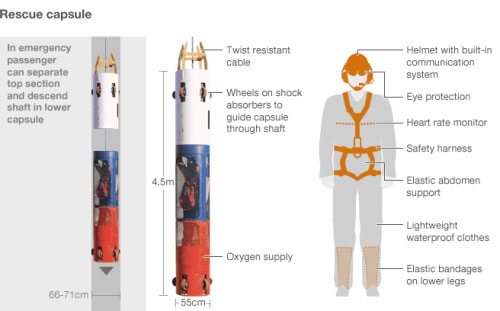 在救援艙內(nèi),礦工們將會(huì)穿上特制、重量超輕的防水服。他們還將戴上心律監(jiān)測(cè)儀以便地面人員可隨時(shí)監(jiān)控礦工在升井過(guò)程中任何細(xì)微的身體變化。