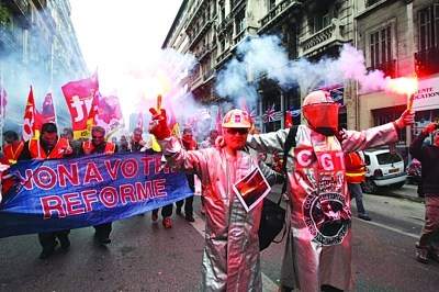 為削減財(cái)政赤字、避免陷入主權(quán)債務(wù)危機(jī),法國與其他歐洲國家一樣,推出系列財(cái)政緊縮政策,包括定于20日在參議院投票表決的退休制度改革法案。法案把最低退休年齡和可領(lǐng)取全額養(yǎng)老金的退休年齡提高2年,一經(jīng)公布便引發(fā)大規(guī)模罷工抗議。