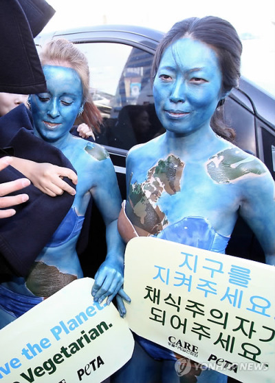 據(jù)稱,9日下午,“從倫理的角度對(duì)待動(dòng)物的團(tuán)體”成員加拿大人F某(24歲、女)和“愛護(hù)動(dòng)物實(shí)踐協(xié)會(huì)”成員韓某(34歲、女)幾乎赤裸著身體在COEX附近舉行游行示威,呼吁人們只吃素食,不要吃肉。