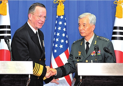 美軍參謀長(zhǎng)聯(lián)席會(huì)議主席馬倫8日與韓國(guó)聯(lián)合參謀本部議長(zhǎng)韓民求舉行會(huì)談,商討朝鮮半島局勢(shì)。