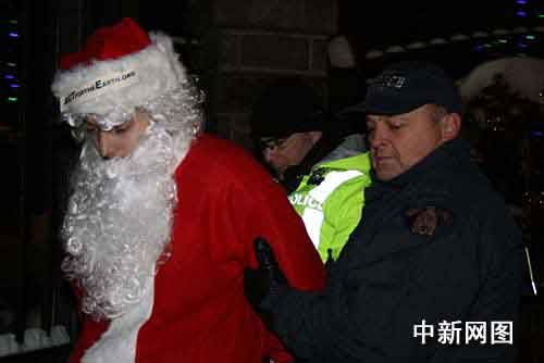抗議行動(dòng)中,警察一共抓了7名環(huán)保人士,雖有肢體接觸但沒有任何人受傷。一排著紅衣服的“圣誕老人”把囚車塞得滿滿的,剩下一些舉著標(biāo)語牌的老弱婦孺在原地繼續(xù)游行。