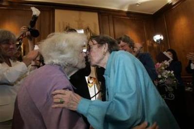 據(jù)美國《明報(bào)》報(bào)道,66歲的泰勒跟54歲同志情人奧爾森,多年來一直爭取同性婚姻權(quán)利,正是他們的上訴,最終促成加州最高法院推翻州政府的同性婚姻禁令。兩人已準(zhǔn)備在16日下午5點(diǎn)01分結(jié)婚,成為洛杉磯縣區(qū)首對(duì)正式同志“夫妻”。泰勒說﹕“我們準(zhǔn)備在法院外結(jié)婚,因?yàn)檫@是我們多年來斗爭的地方,在這兒結(jié)婚宣布‘我們勝利’,無疑是美妙的事。”在加州同志勝地西好萊塢,有酒店表示,在最高法院上月裁定同性婚姻合法后,入住率不斷攀升,“我們17日的房間差不多已經(jīng)訂滿,未來一周也差不多。以往我們的入住率不會(huì)這樣高!