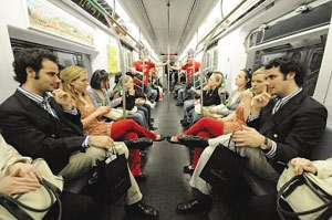 日前,15對同卵雙胞胎按照亞當斯的要求,一起在紐約市布魯克林橋的地鐵站碰頭,15對同卵雙胞胎走進地鐵車廂后,每對雙胞胎都排著隊各自坐在了過道兩側(cè)的座位上,并且每個雙胞胎要直接面對著自己的雙胞胎兄弟或姐妹。當15對雙胞胎“各就各位”后,他們接下來要做的事就是盡可能保持動作一致,如果一個雙胞胎用手撓頭,那么他的同卵雙胞胎也必須用手撓頭;一個雙胞胎看報紙,他的同卵雙胞胎也必須低頭看報紙?傊,他們就好像是對方的“鏡中影像”一樣。這些同卵雙胞胎還被告知,如果有乘客詢問他們到底發(fā)生了什么事,他們要表現(xiàn)得一無所知,甚至好像壓根沒看到坐在自己對面的同卵雙胞胎一樣。