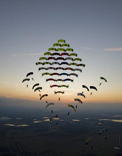 日前,100名高空跳傘運(yùn)動(dòng)員在美國佛羅里達(dá)州千米高空進(jìn)行特技表演,組成了世界上最大的鉆石菱形圖案,成功打破了2005年由德國85名跳傘運(yùn)動(dòng)員創(chuàng)造的世界紀(jì)錄。