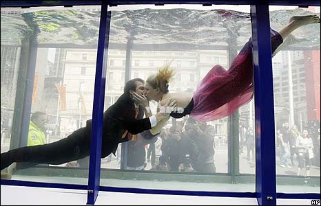 9名穿著時尚的模特,爬上梯子后,縱身跳入位于悉尼環(huán)形碼頭的水槽,讓攝影師捕捉鏡頭,同時也取悅路人。