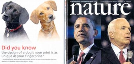 自然雜志封底刊登狗頭照,封面刊登奧巴馬麥凱恩照片。