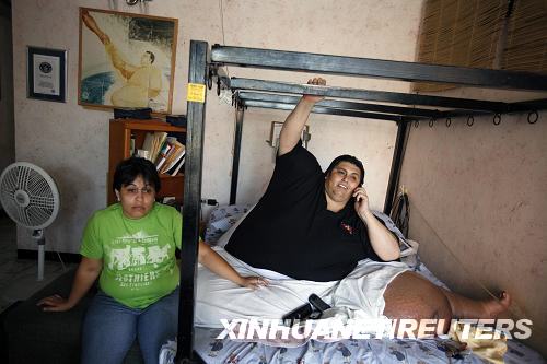 10月2日,在墨北部城市蒙特雷,體形肥胖的曼努埃爾·烏里韋(右)與女友格拉迪亞·索利斯在家中。烏里韋體重曾達(dá)到560公斤,被《吉尼斯世界紀(jì)錄大全》列為世界最胖之人。經(jīng)過(guò)兩年多的減肥治療,他目前體重已降至310公斤左右。烏里韋近日宣布,他將在本月26日迎娶相戀兩年半的女友。新華社/路透