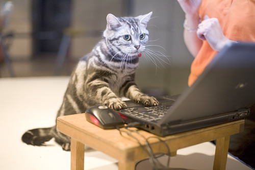 一只美國(guó)短毛貓?jiān)谛阌?jì)算機(jī)技能。