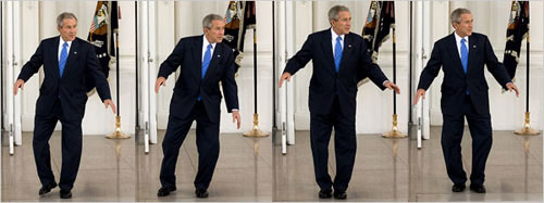 2008年3月5日,在獲得黨內提名所需的1191張黨代表票后,美國共和黨總統(tǒng)候選人約翰·麥凱恩前往白宮,與總統(tǒng)布什共進午餐,作為布什正式宣布支持他的前奏。但布什卻被麥凱恩晾在白宮北門等了好一會兒。早早來到白宮北門的布什左等右等麥凱恩不到,為了調節(jié)氣氛,竟然在眾位記者面前獨自跳起踢跶舞來。