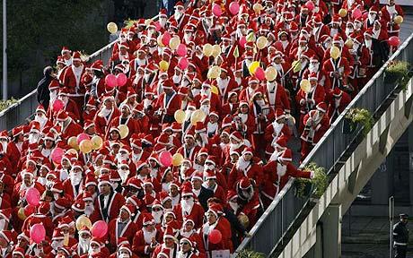 12月14日,葡萄牙城市波爾圖出現(xiàn)了一支由14000名圣誕老人組成的游行隊伍,他們都是由當(dāng)?shù)厥忻裱b扮而成的,其中不乏婦女和兒童。所有人都身著紅白色的衣服,帶著紅白色的帽子,像模像樣地在下巴上沾了白色胡子,組成了紅色的海洋,進(jìn)行慈善宣傳。這次圣誕老人游行人數(shù)打破了世界紀(jì)錄。